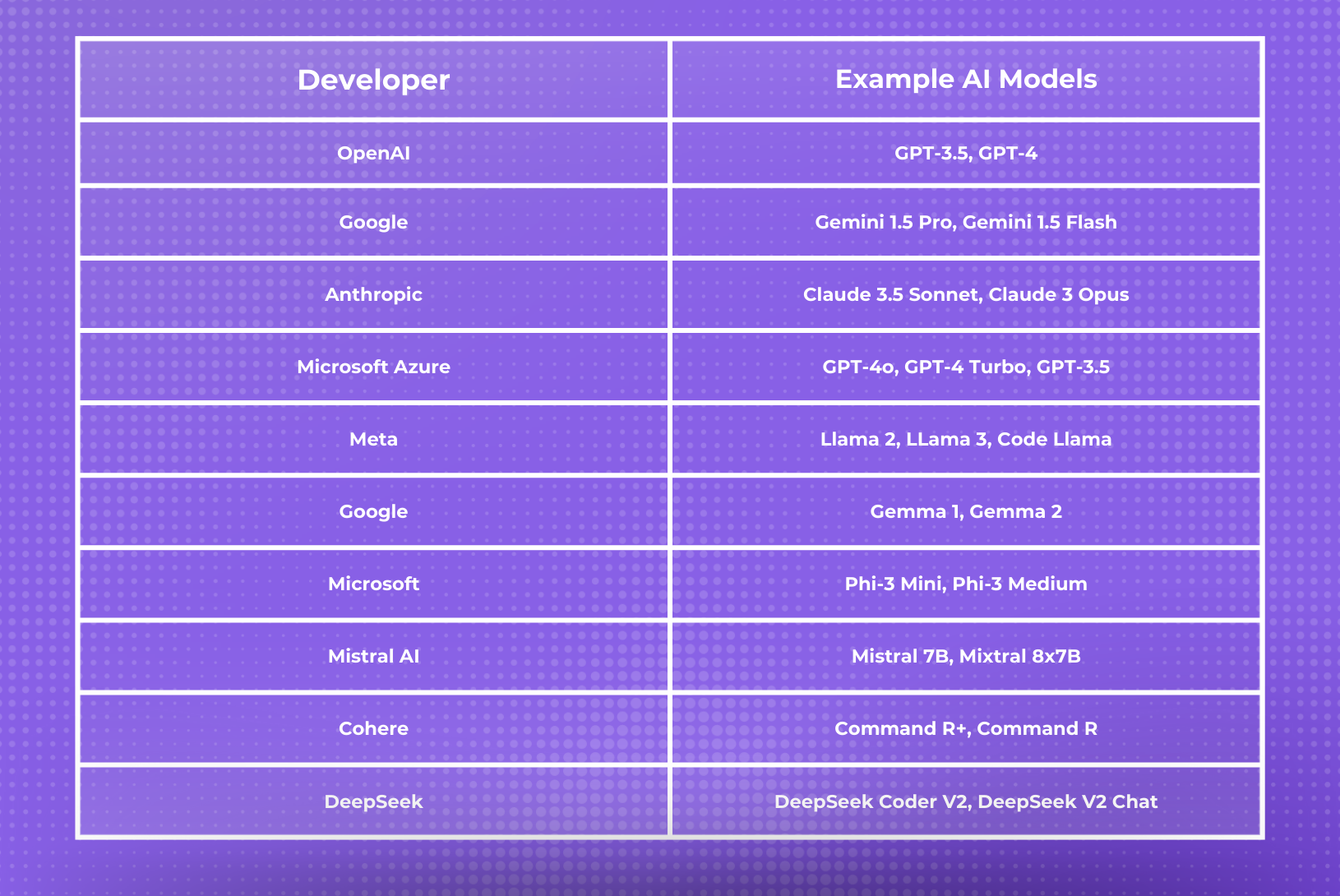 Here’s a quick breakdown of some prominent developers and their AI models:
